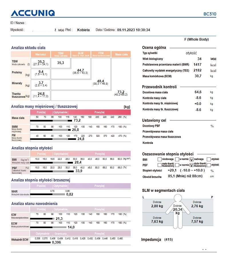 Przykładowy raport z analizy składu ciała z Salonu Niemcza